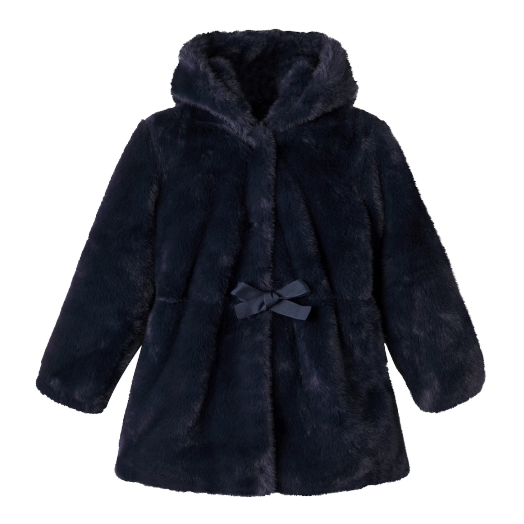 Elevate her winter style with this exquisitely soft navy blue faux fur coat by the iconic French designer Tartine et Chocolat. Features a cozy hood for extra warmth and a subtly cinched waist with a grosgrain ribbon tie for a flattering, classic Parisian silhouette. Perfect for special occasions and everyday luxury.