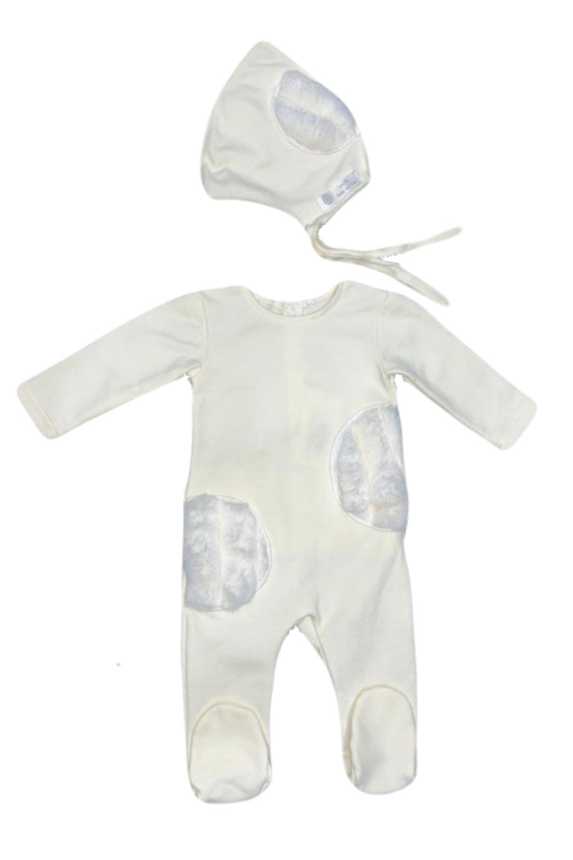 Keep babies cozy and stylish with the Latte Ivory Footie + Hat Fur Circles—soft fabric with playful fur circle details, perfect for everyday wear or gifting.