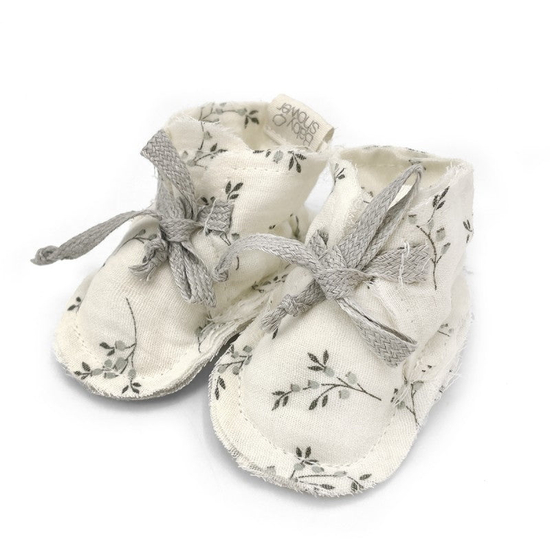 These delicate baby booties close with a charming linen ribbon and feature a soft cotton lining for gentle comfort. Measuring 11 x 5.5 cm, they are crafted from 100% OEKO-TEX certified cotton and thoughtfully made in Spain—perfect for newborn coziness, gifting, and timeless baby styling.