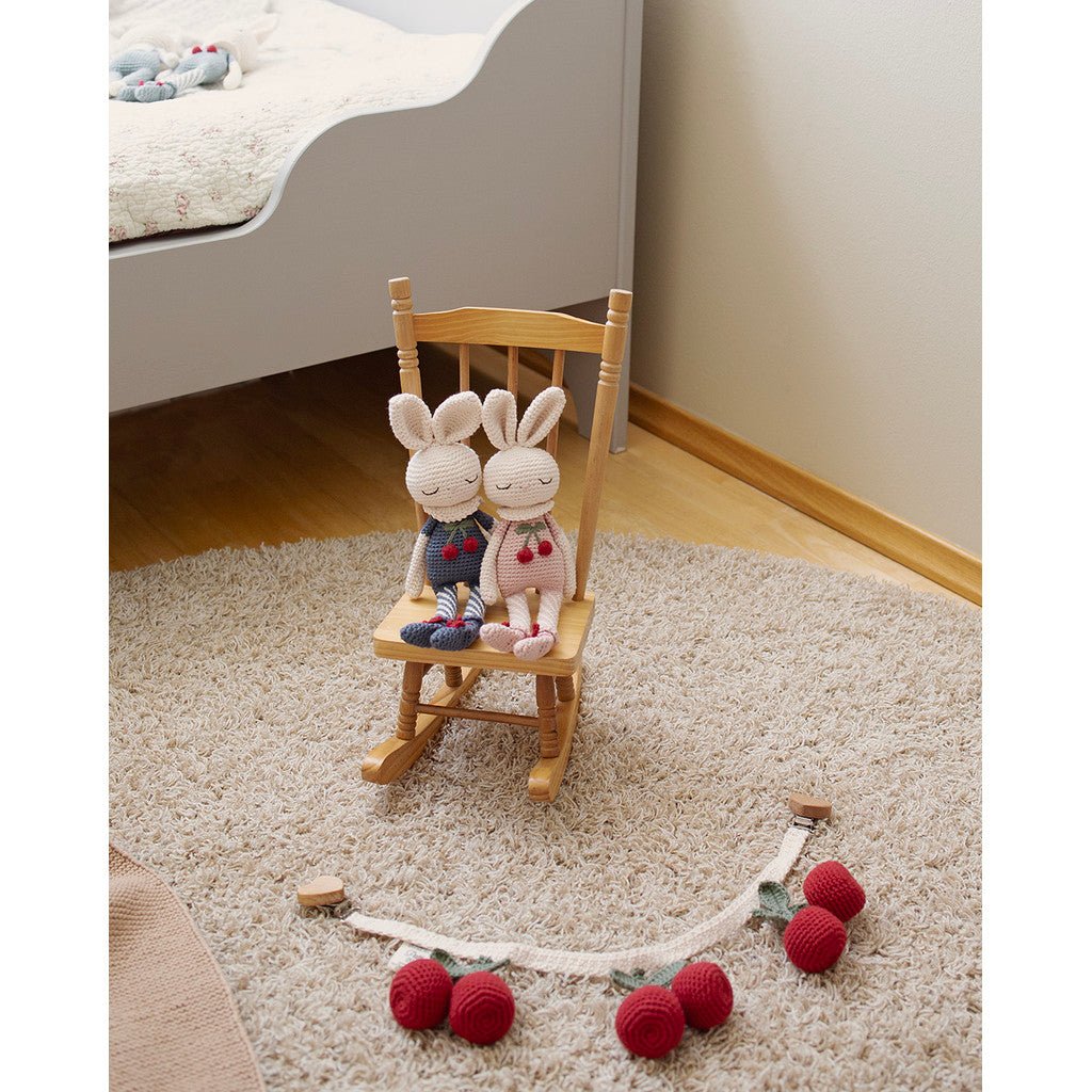 Soft and sweet like the fruit. This Cherry Pram Chain is the perfect gift for a summer atmosphere, soft and easy to grab. Ideal toy to stimulate your baby with different shapes and sounds. The heart-shaped wooden clips are perfect for securely hanging from a baby stroller.