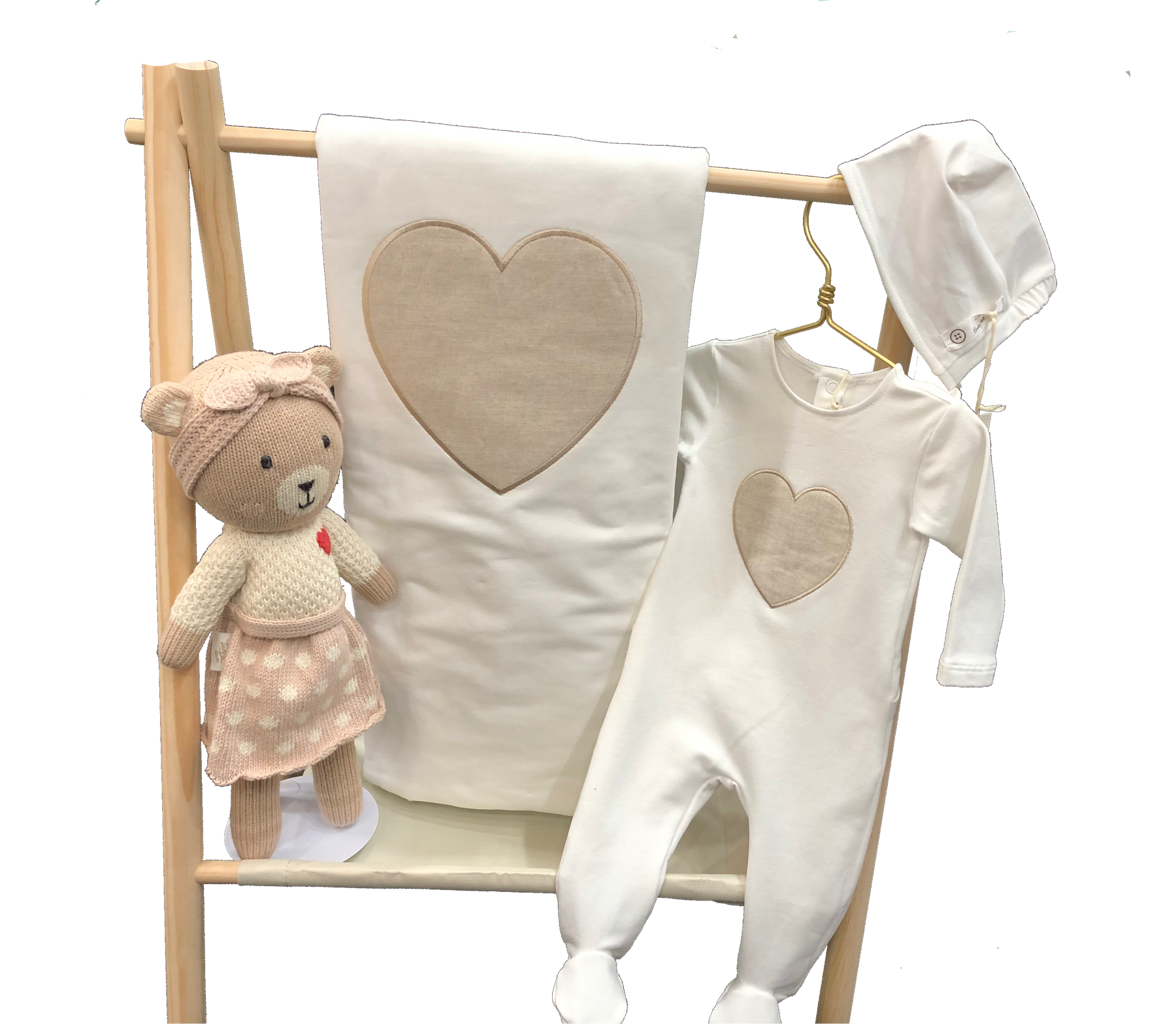 - Matching white cotton bonnet with heart applique for extra cuteness and warmth.