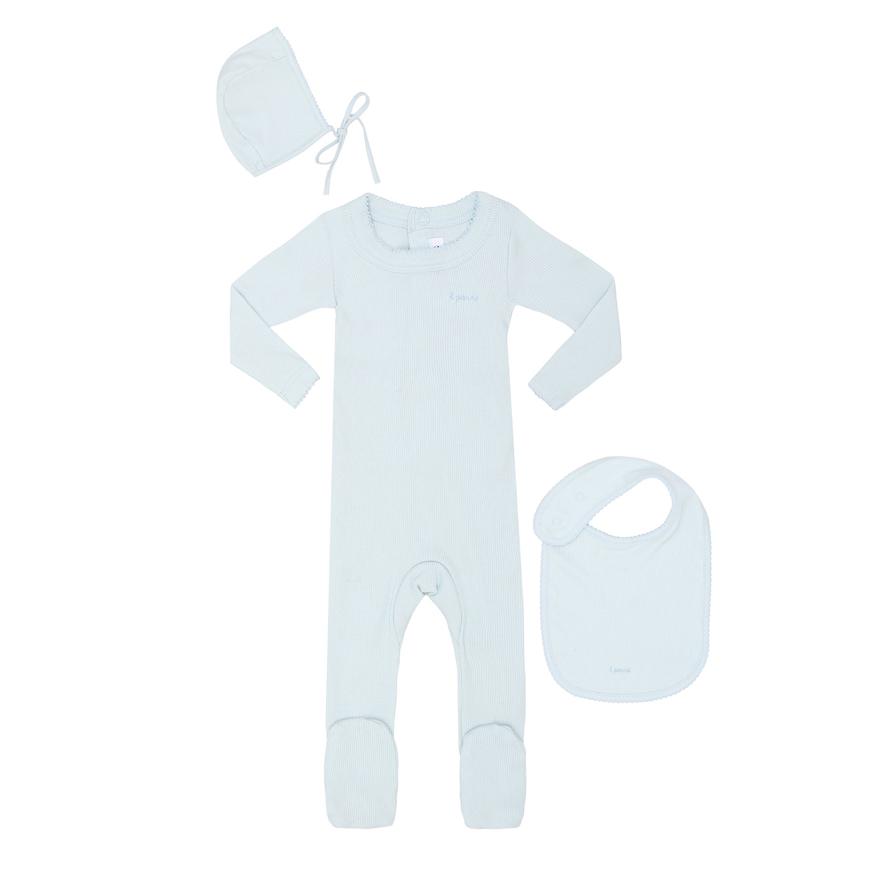 Keep your baby cozy and stylish with the Parni Light Blue Ribbed Pico Footie and Bib Gift Box. Crafted from soft, premium materials, this adorable set combines comfort and charm, making it perfect for everyday wear, special occasions, or gifting.