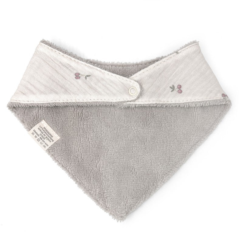 Bib designed to be used from birth up to baby's first year. Front side made in printed fabric and back in high quality white terry cloth.