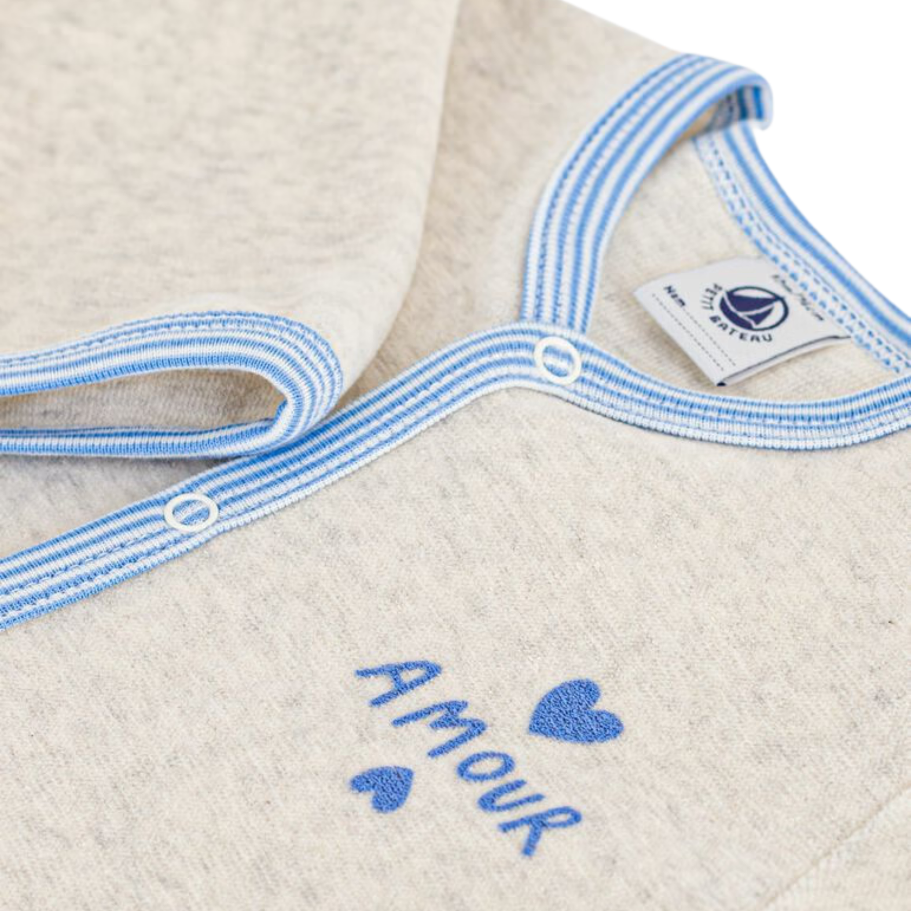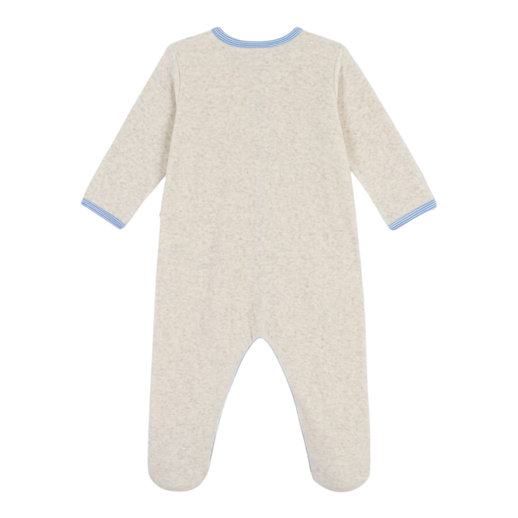 Discover the Petit Bateau Baby Boy Velour Footie in Oatmeal with blue trim, crafted from soft velour for cozy comfort. A timeless essential for sleep, cuddles, and everyday moments.