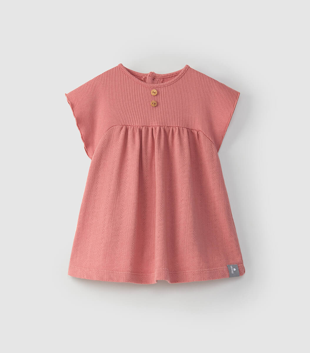 Organic cotton dress with ajour chest and bat sleeves. Decorative wooden buttons on the front.