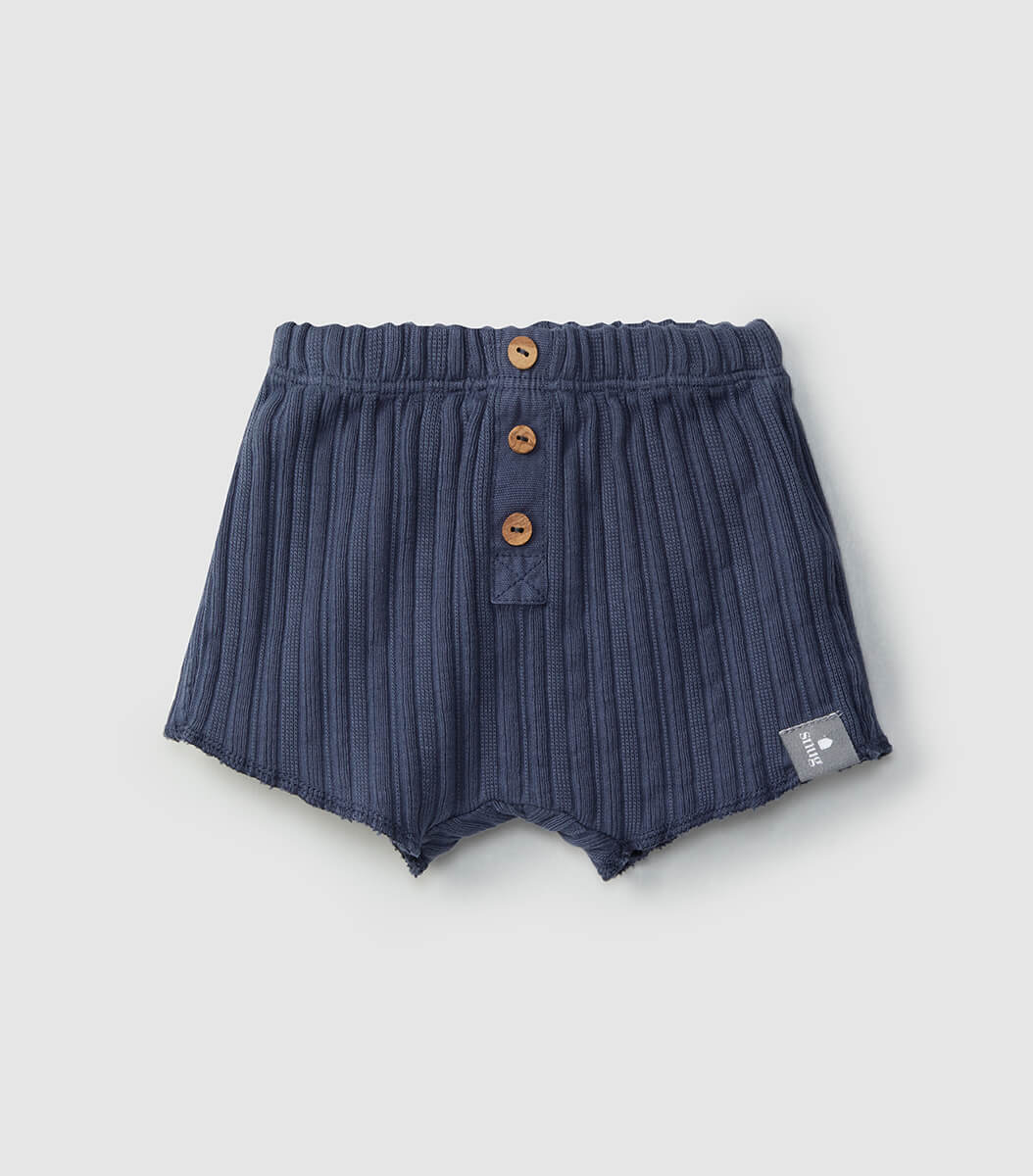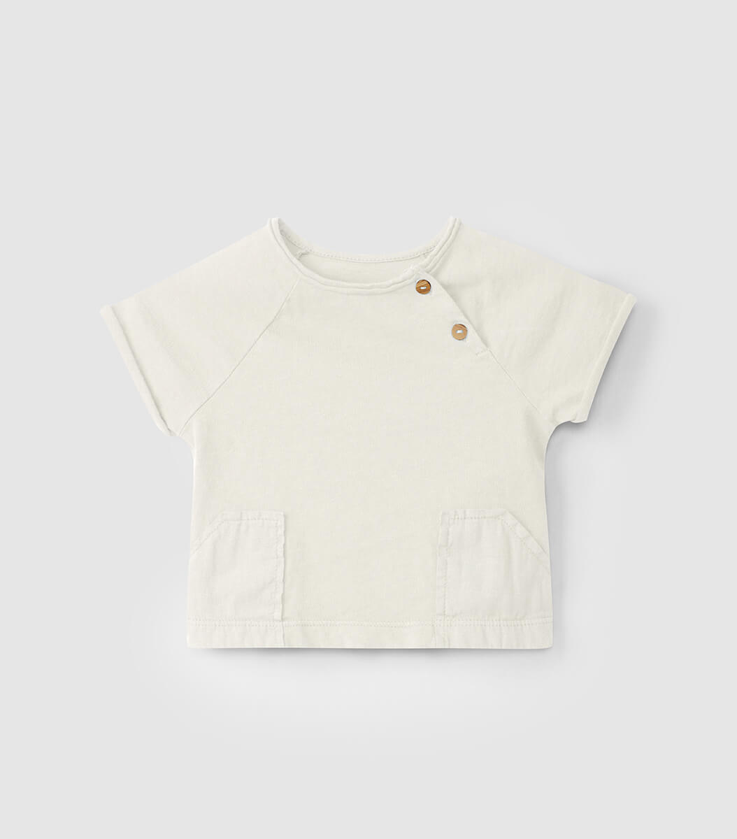 Set with t-shirt with cotton linen pockets and ribbed cotton shorts with decorative wooden buttons and elasticated waist. T-shirt fastens on the shoulder, at the front, with wooden buttons.