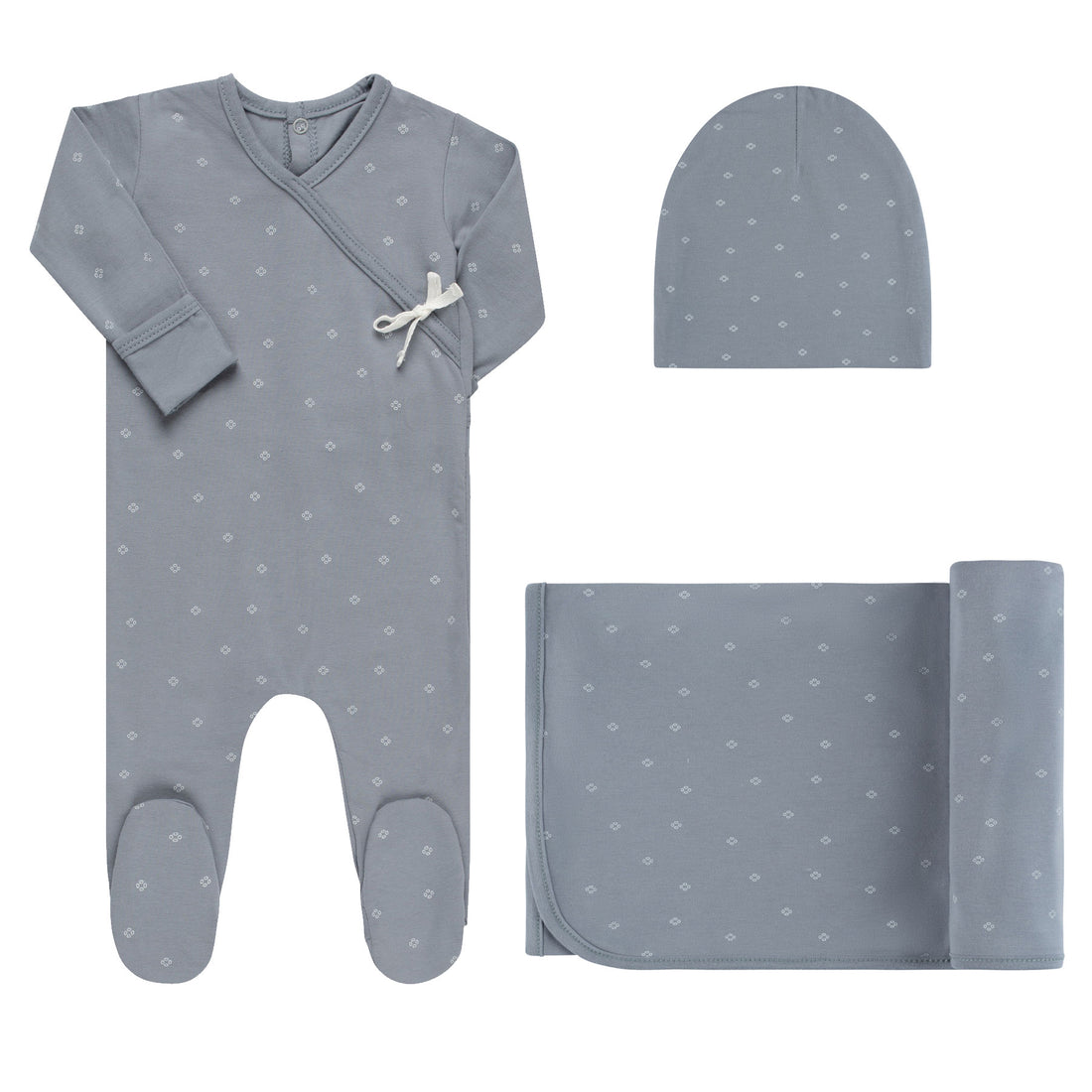 The Elys & Co Floral Kimono Slate Blue 3 Pc Giftbox makes the perfect gift for any baby. Featuring a jersey cotton kimono-style footie with a back snap closure, this set also includes a footie blanket and hat. Soft and comfortable, your little one is sure to love it.